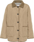 Vadderad jacka i ljusbeige med brun kontrastkrage. Knäppning framtill, stora utanpåfickor och ledig passform med vågig quiltning.