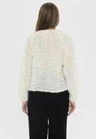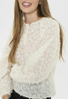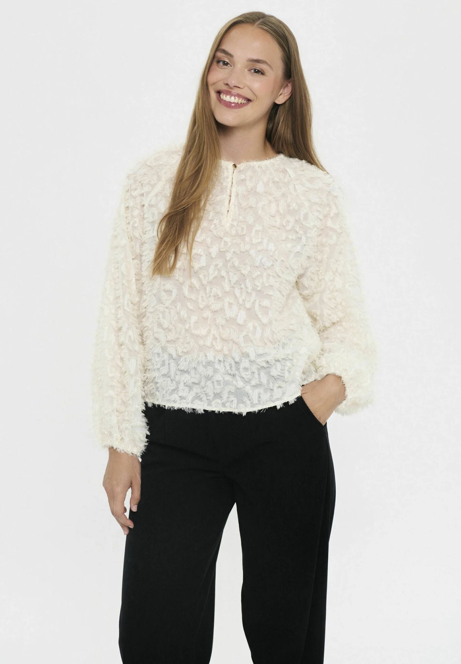 Blus med lång ärm och genomgående strukturmönster. Rak passform och rund hals med liten knapp framtill. Ärmsluten är något rynkade. Längden slutar vid höften och inga synliga detaljer utöver mönstringen.