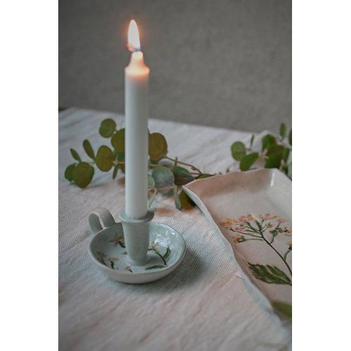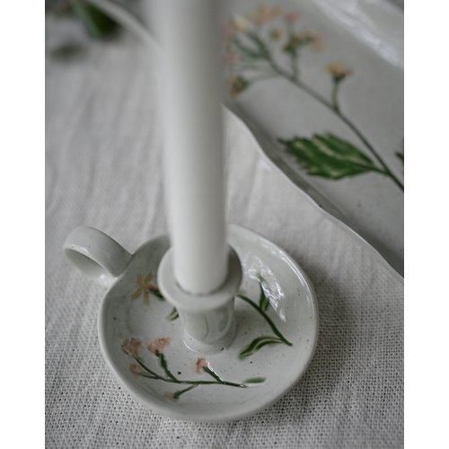 Malva ljusstake med handtag är gjord i porslin med ett fint blommönster.