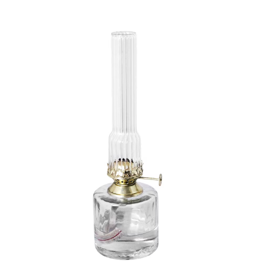 Elegant fotogenlampa i räfflat glas och mässingsbrännare. Inklusive en veke. Använd gärna Strömshagas lampolja till denna oljelampa, säljs separat.