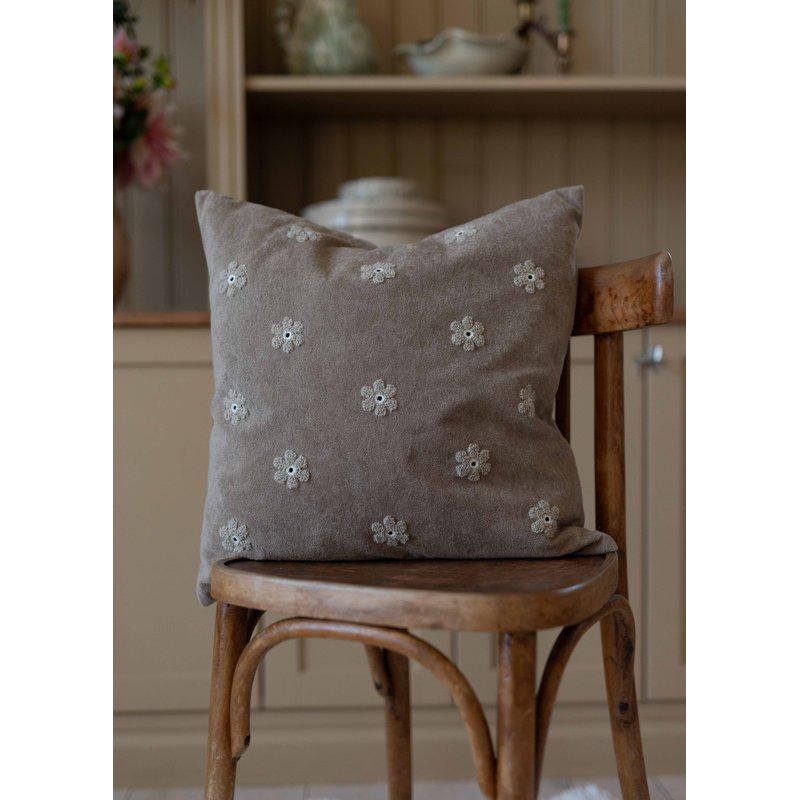 Kuddfodral med små tuftade blommor på som skapar en härligt mjuk och taktil struktur. Det lena tyget är både bekvämt och dekorativt samt ger en varm och ombonad känsla i rummet.