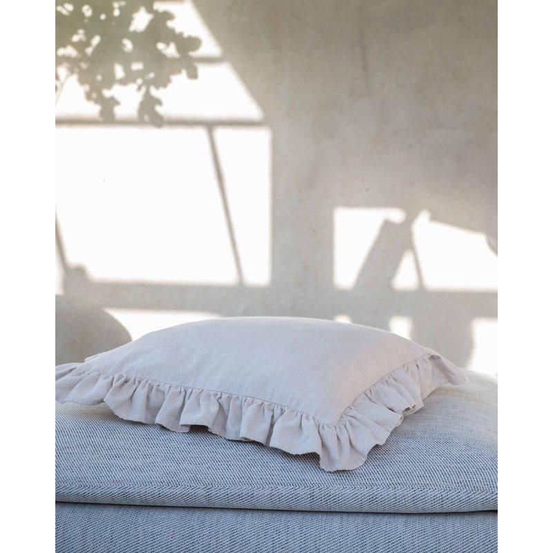 Kuddfodral med volang runtom tillverkad av en blandning av återvunnen bomull och återvunnen polyester, vilket gör den till ett mer hållbart val. Tygets struktur har en linnekänsla som ger ett naturligt, mjukt och tidlöst uttryck.