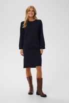 Stickad klänning med rak, avslappnad passform och rund halsringning. Långa ärmar ger komfort och ribbade detaljer skapar en stilren look. Perfekt för vardag eller lager-på-lager. Från Saint Tropez