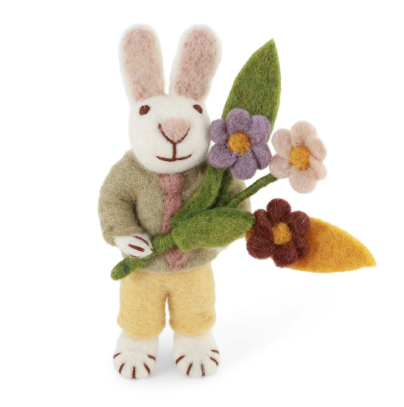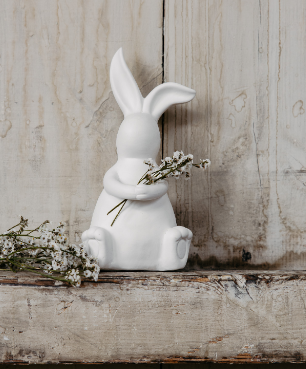 Vit kanin med blå hängselbyxor/vit blomma
