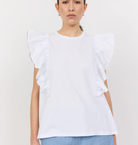 KOWA 21 från Levete Room är en unik topp tillverkad av 100% ekologisk bomull. Den har en rund halsringning, volangärmar och en avslappnad passform. Den här toppen passar bra till jeans för en avslappnad look eller till byxor för en mer formell look.