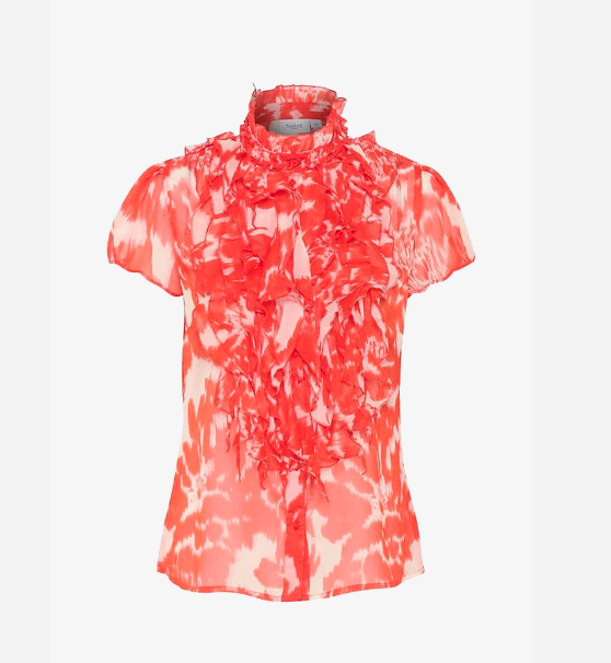 Kortärmad röd och vit skjorta med hög hals, volangdetaljer på bröstet och nedåt, samt knappstängning.