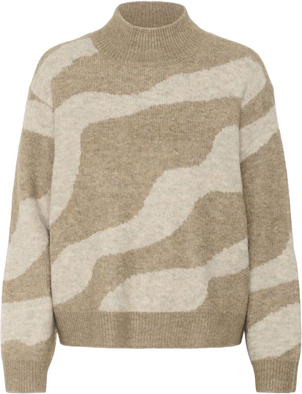 Stickad tröja i beige nyanser med abstrakt vågmönster i ljus och mellanbeige. Hög ribbad krage, långa ärmar och rak, ledig passform. Mjuk och något fluffig struktur.