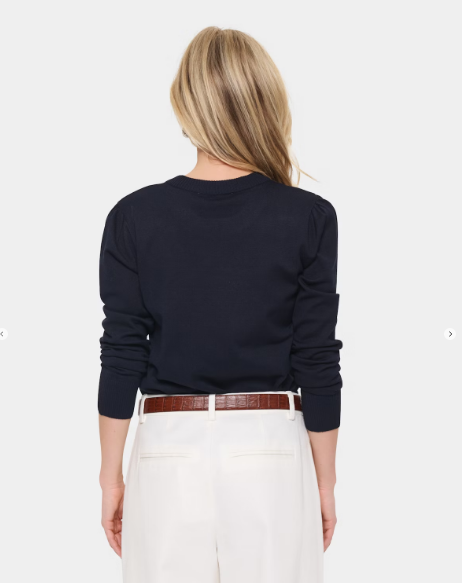 Stickad tröja med rund halsringning och långa ärmar med veck vid axeln. Normal passform med ribbade muddar. Tillverkad i ett mjukt, finstickat material.