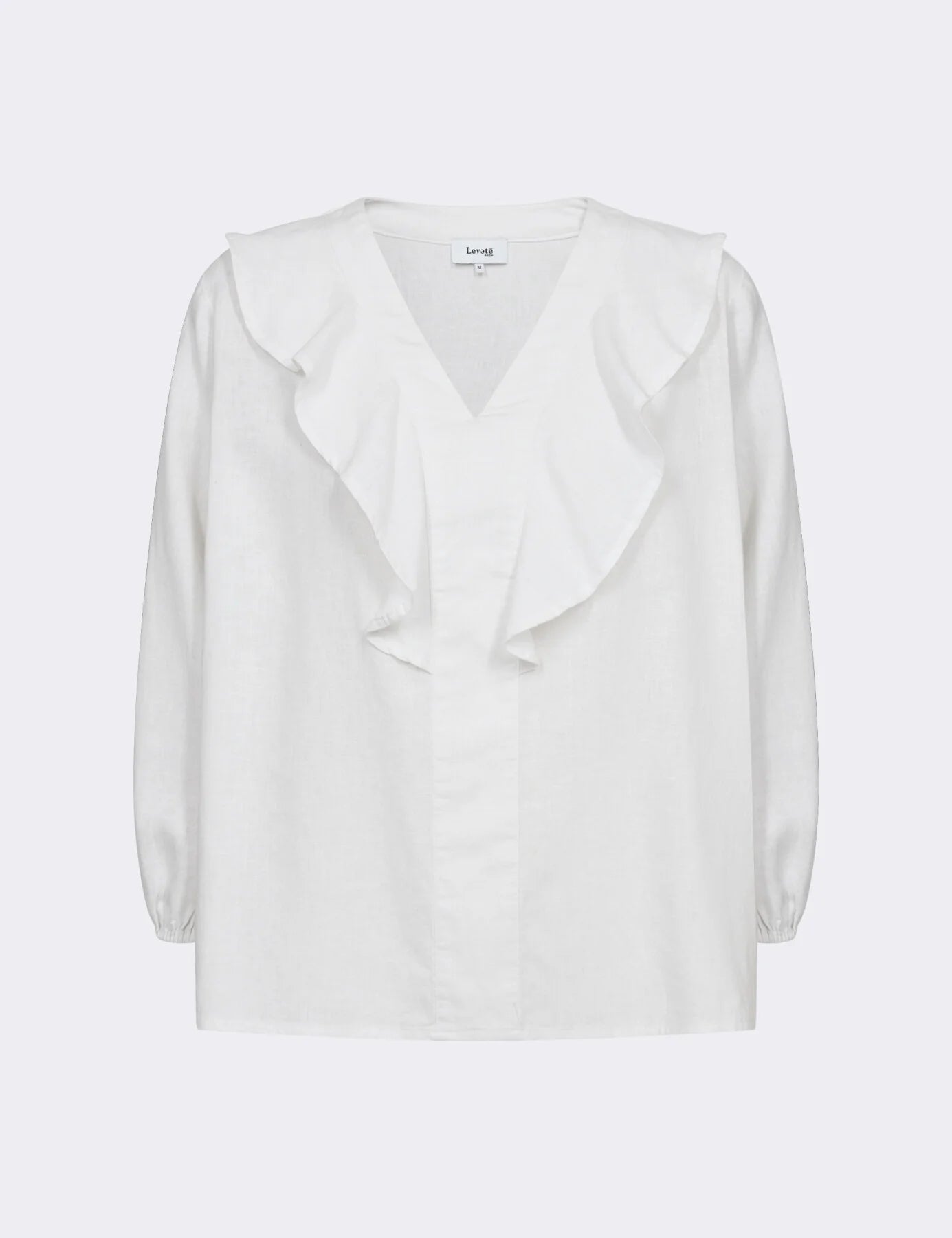 Denna blus är en sofistikerad blus som består av 55% linne, 45% viskos. Den här blusen har en stor volangkrage, en djup v-ringning och en avslappnad passform som draperar bekvämt över kroppen. Den passar bra med skräddarsydda byxor och kjolar för ett raffinerat men ändå avslappnat utseende.