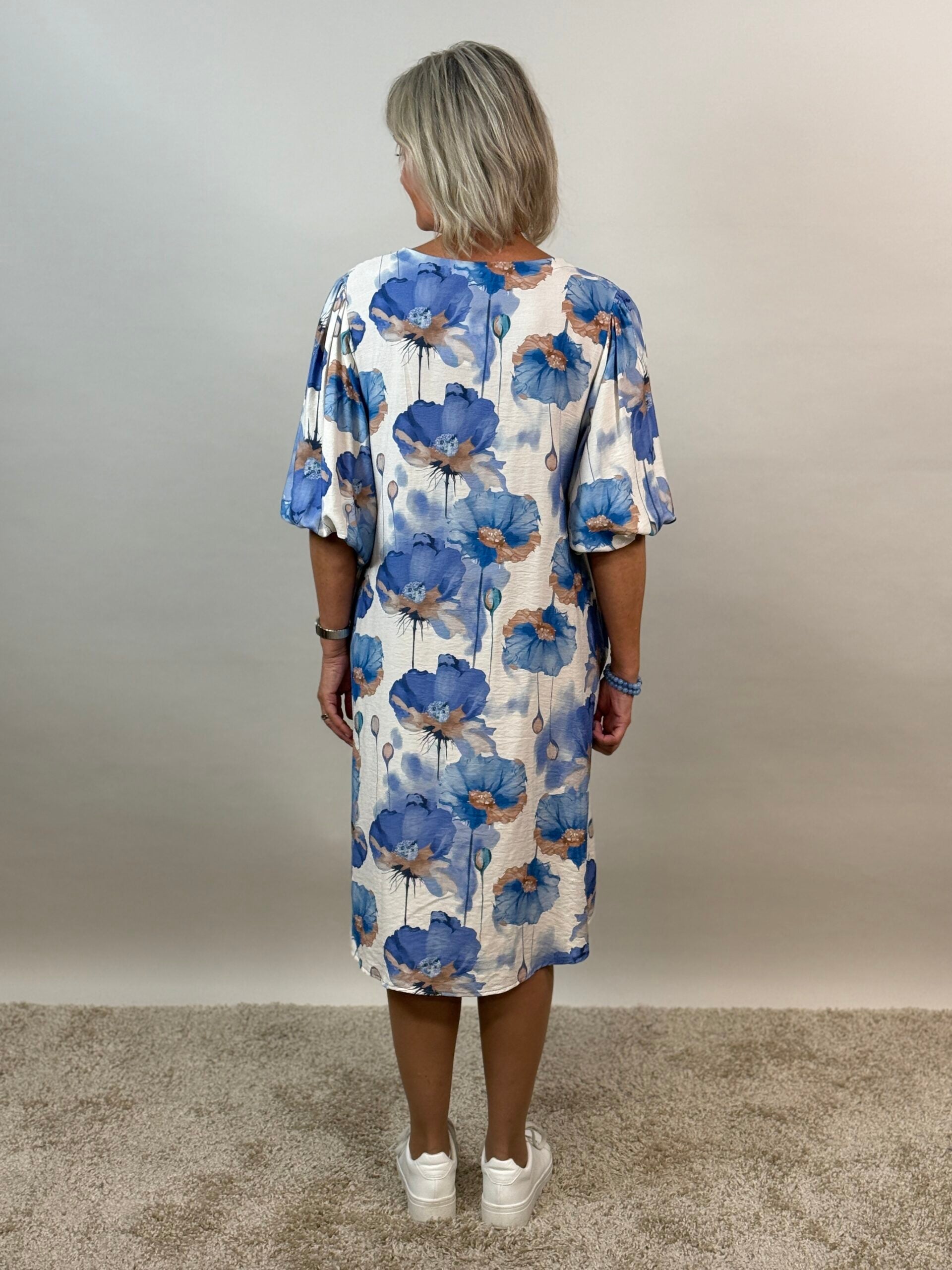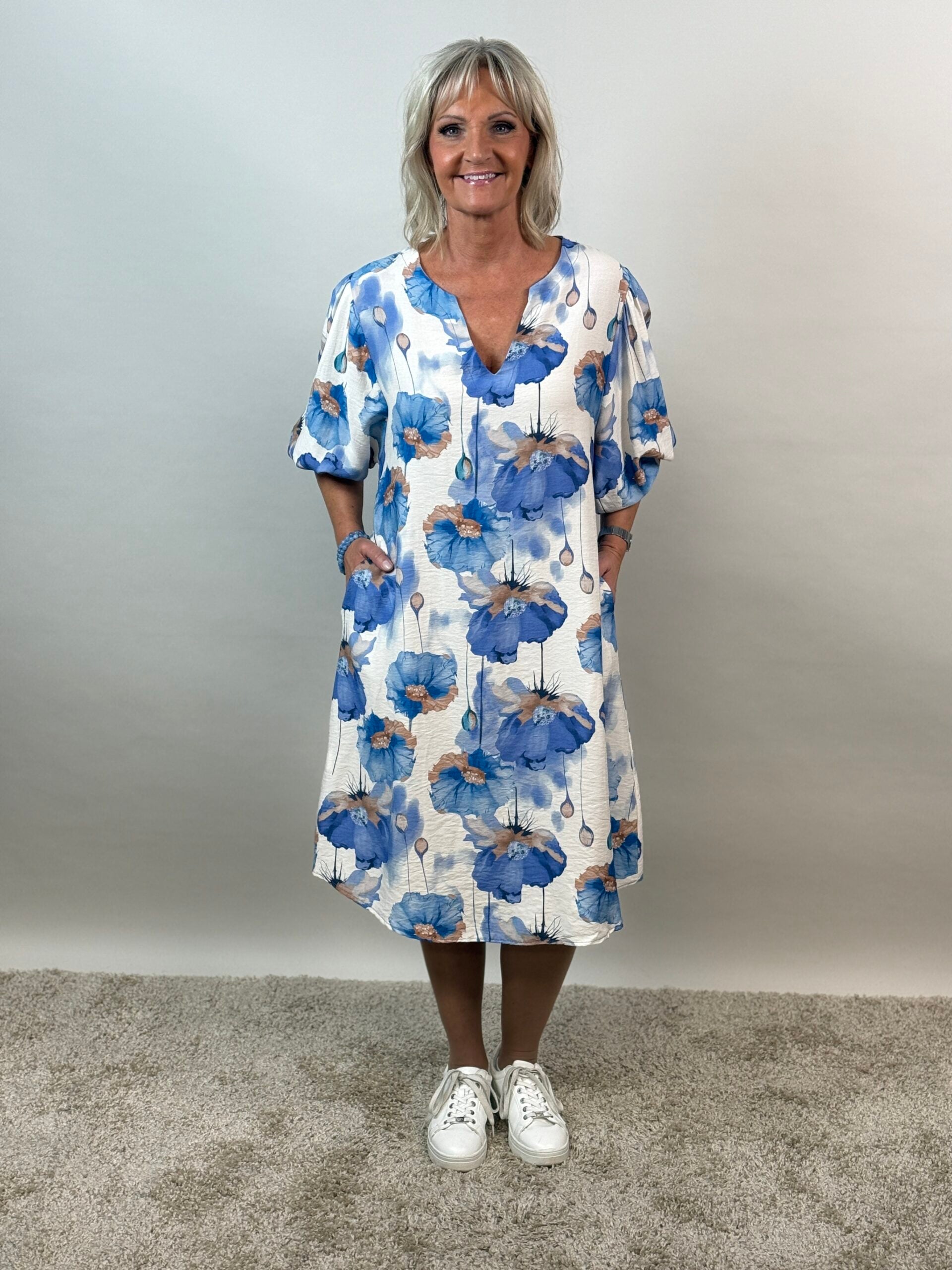 Härlig storblommig v-halsad klänning med puffärm & fickor i sidan från Mix by heart. Fina blå/bruna toner på en offwhite botten, sydd i skönt viskostyg.