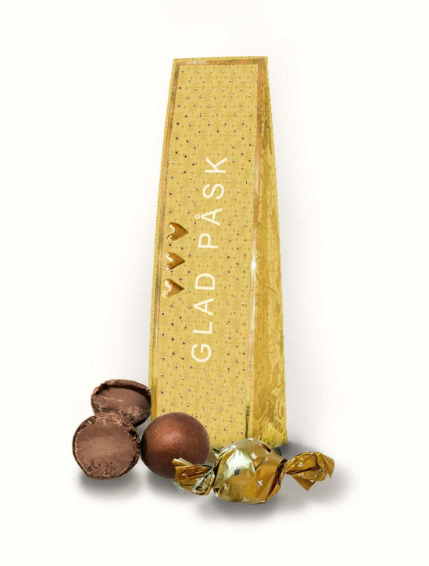 Trevlig Glad Påsk present. Fin att ge som ett kort tillsammans med en present eller nerstucken i en bukett. Innehåller tre styck chokladpraliner.