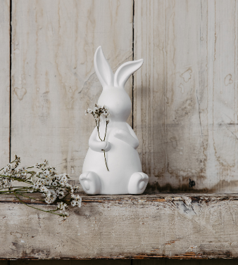 Dekoration i keramik. Emilia är en söt kanin som passar fint med resterande påskdekorationer i kollektionen. Emilia kan dekoreras med en fjäder eller blomma som man kan sätta i hennes hand (levereras utan dekoren som visas på bilderna).