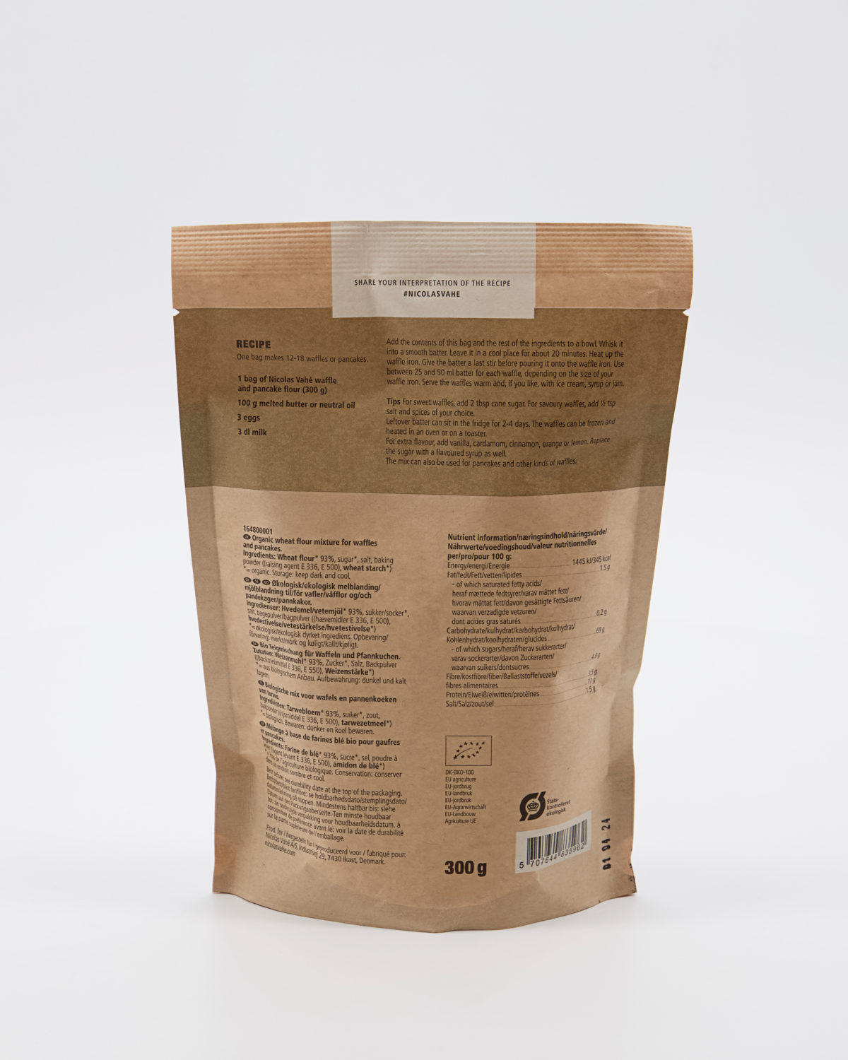Ingredienser; Ekologisk vetemjölsblandning för våfflor och pannkakor vetemjöl 93%, socker, salt, bakpulver ((jäsningsmedel E 336, E 500) vetestärkelse) = Ekologiskt.