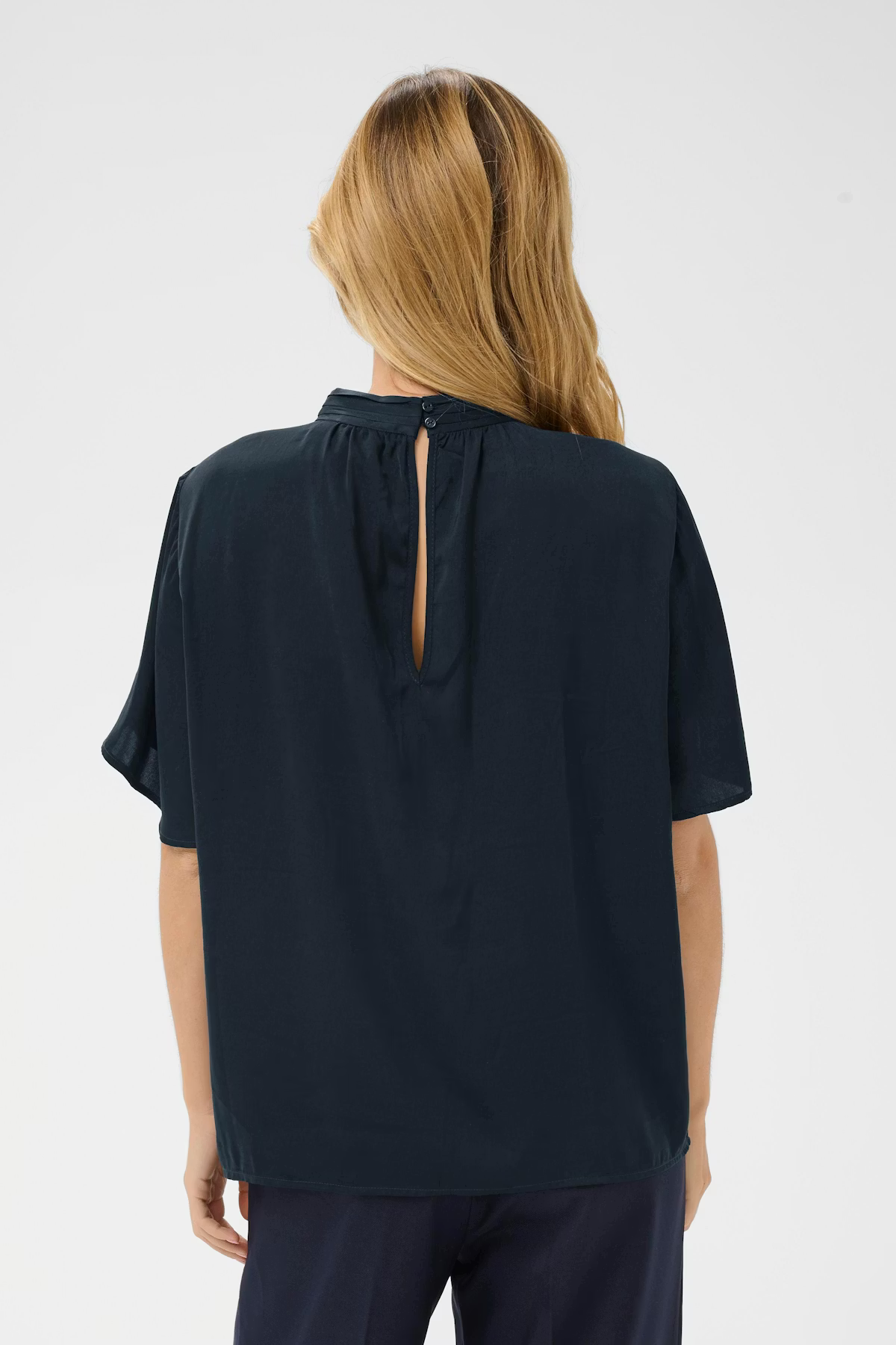 Blusen har lös passform med rynkat hög hals, kort ärm med vid silhuett och slät yta. Knappstängning bak, utan synliga detaljer. Från Saint Tropez.