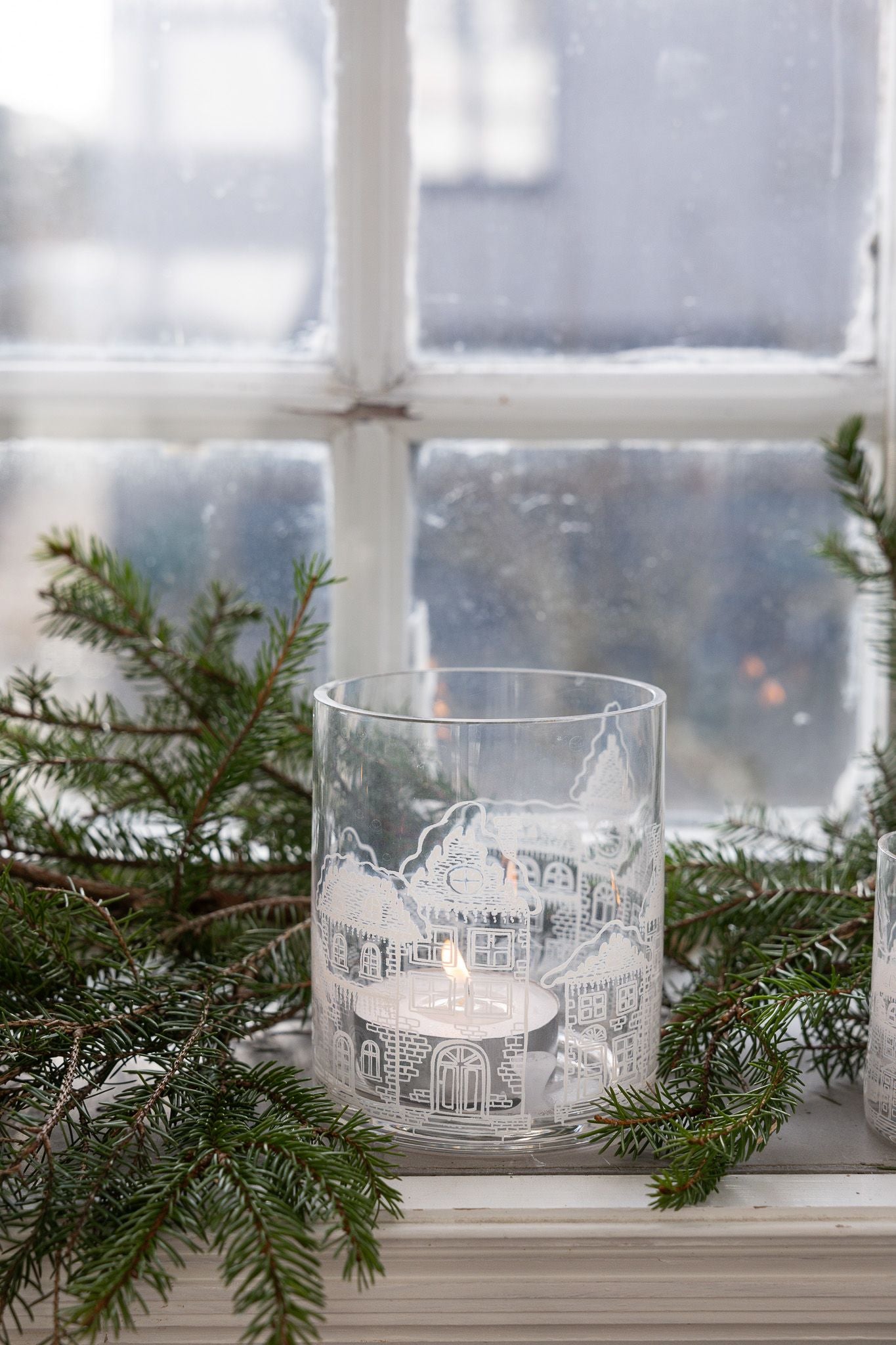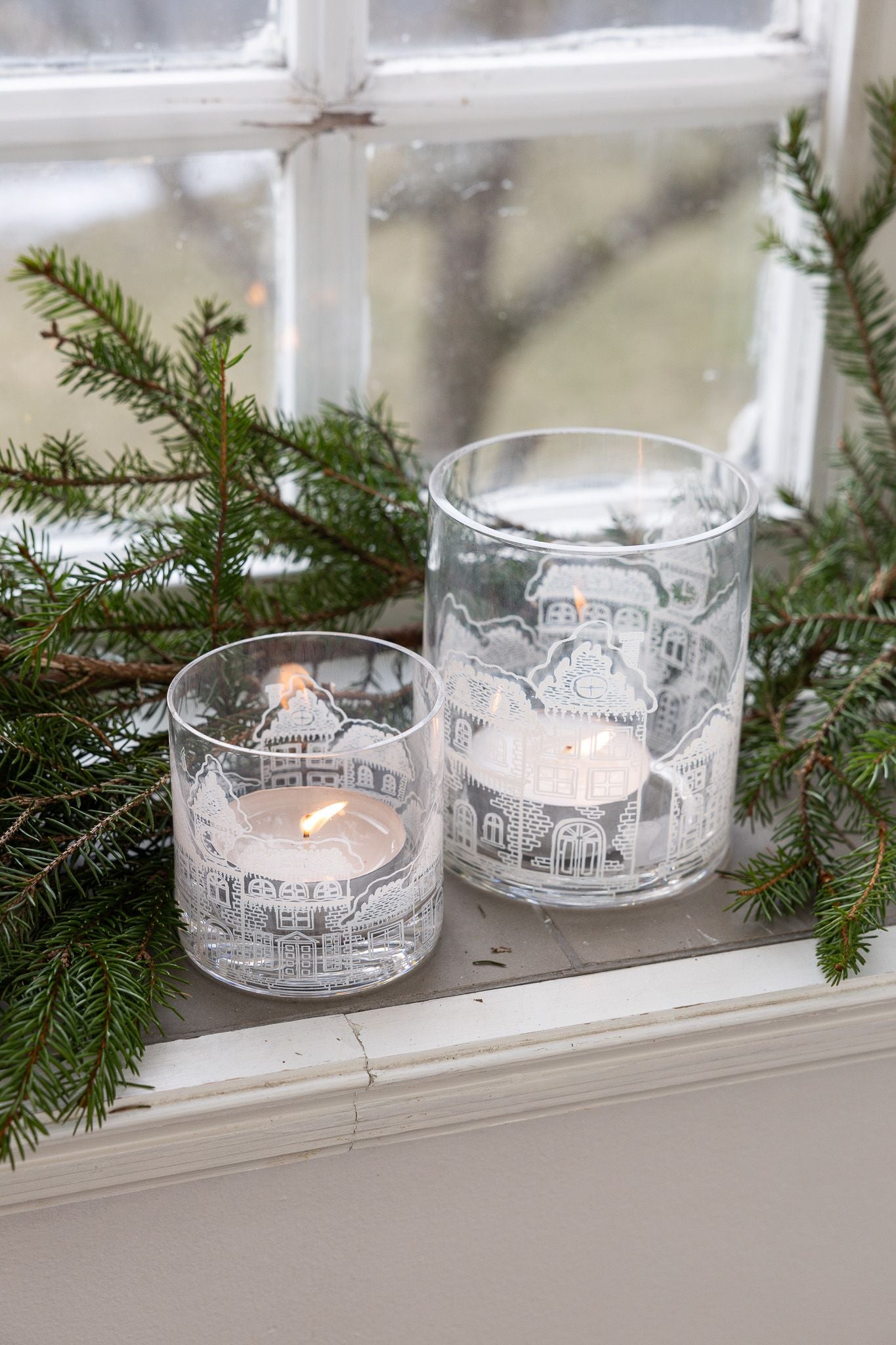 Ljuslykta från Storefactory med ett vintrigt motiv som skapar ett härligt och mysigt sken. Ett perfekt tillskott till din juldekoration.